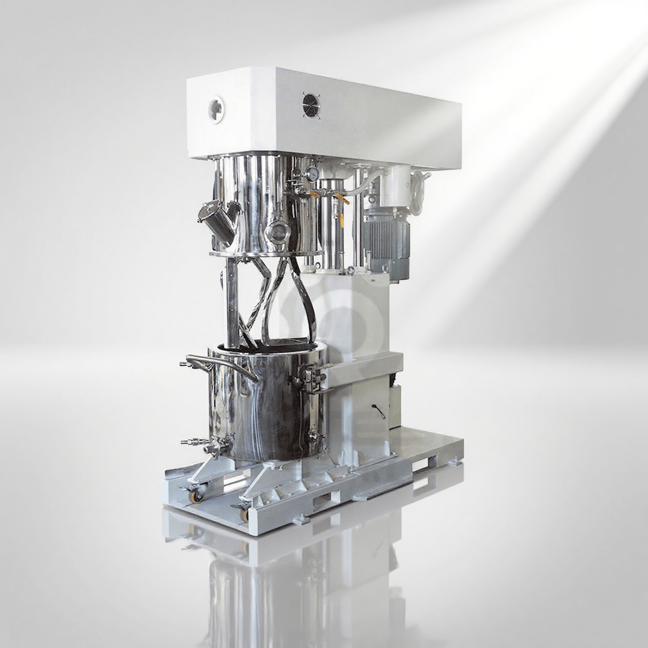 雙行星攪拌機雙行星混合機的攪拌槳葉,在公轉的同時也自轉,使罐體內物料上下及四周循環運動,從而可在很短時間內達到混合(混煉)效果。罐體內壁為大型立車精加工,再經大型拋光機自動 -